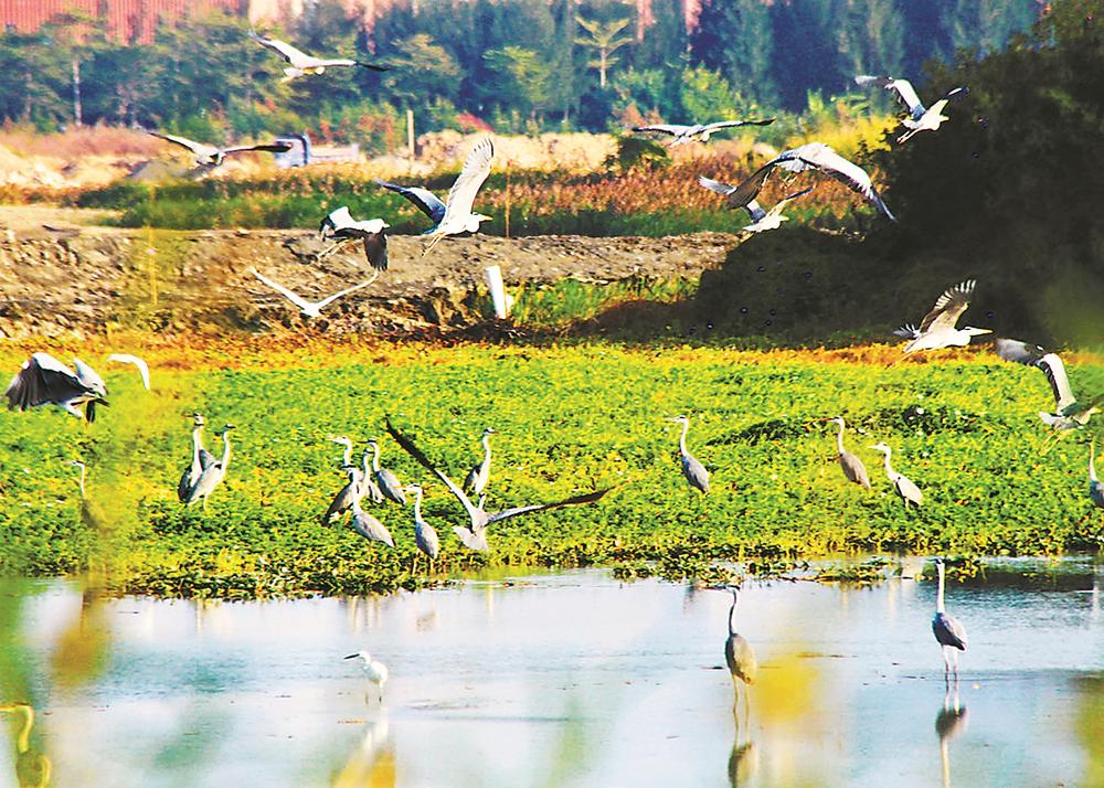 "23日,在东山县西埔镇与前楼镇交界的双东湖浅水滩,数千只灰鹭、白鹭、水鸭等鸟类分散在一片片浮莲和水草上,觅食、休息、嬉闹、跳跃或飞翔。"