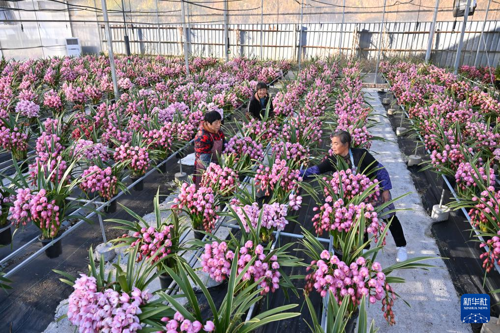 1月14日,位于福建省周宁县浦源镇的紫馨兰园花卉有限公司花卉大棚内,工人挑选大花惠兰盆栽。新华社记者 姜克红 摄