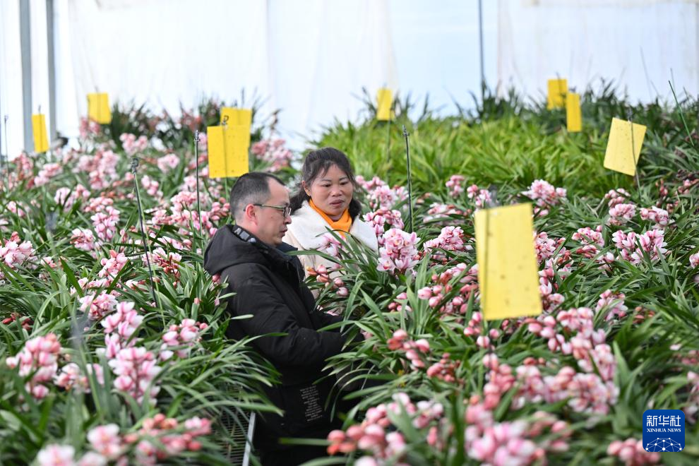 1月14日,在位于周宁县浦源镇的宁德向山兰园植物科技有限公司花卉大棚内,周宁县花卉办工作人员(左)与企业管理人员查看大花惠兰长势。新华社记者 姜克红 摄