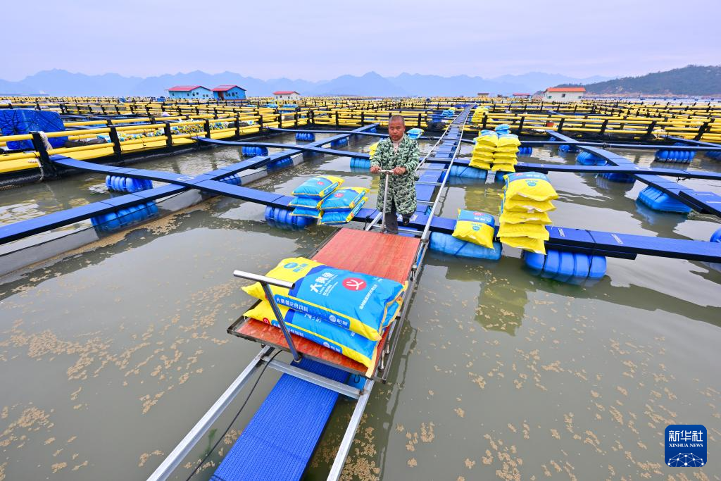 1月23日,在福建省宁德市霞浦县北壁乡海上养殖区,大黄鱼养殖户在运送饲料。新华社记者 姜克红 摄