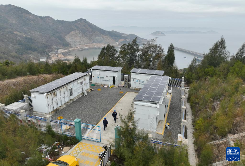 1月26日,刘江平(左)和同事蒋立云在霞浦县海岛乡微电网巡查(无人机照片)。新华社记者 林善传 摄