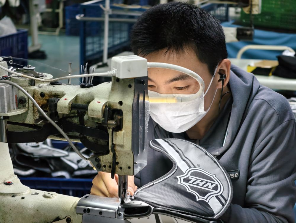厦门博特运动器材有限公司生产线上,工人在制作印有“NHL”标识的冰球手套。新华社记者 魏培全 摄