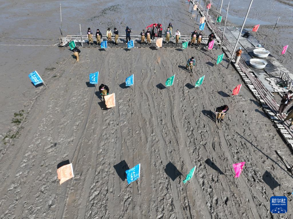 2月8日,选手们在霞浦县滩涂“木泥马”挑战赛上(无人机照片)。新华社记者 姜克红 摄
