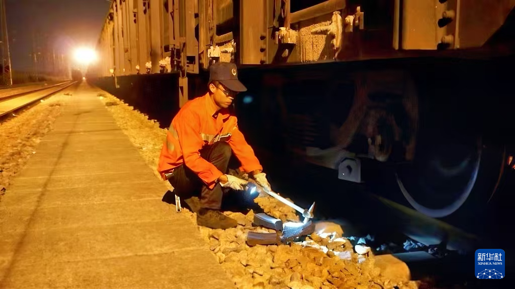 今年是王奇德参加工作后的第4个春运。接到指令后,他一把抓起检车锤与工友快步走向目标车辆。半蹲、侧身、探入车底,动作一气呵成。车下空间狭窄,制动梁与拉杆纵横交错,他小心地收着肚子,几乎贴着轨枕挤进去,手电的光束在火车轮缘与踏面之间快速扫过。