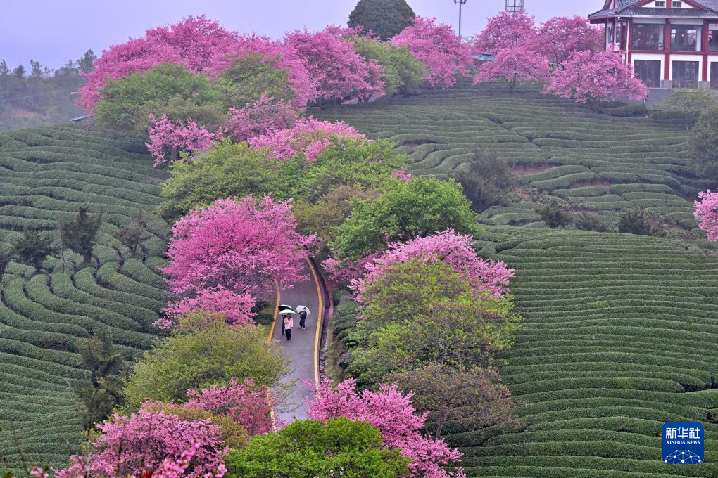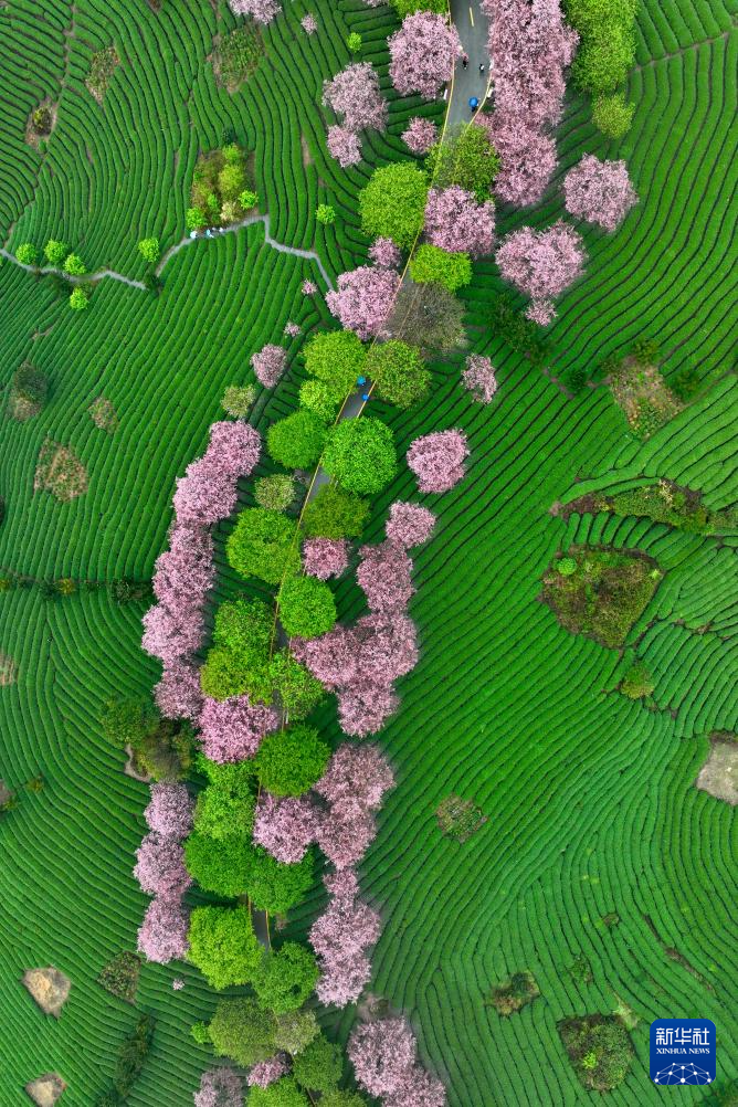 2月28日,游客在福建省漳平市永福镇台品樱花茶园游玩(无人机照片)。新华社记者 姜克红 摄