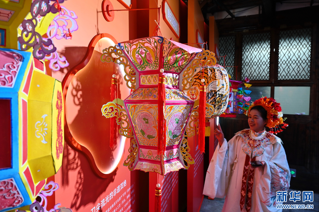3月3日,游客在福州三坊七巷古厝里的花灯前拍照。新华社记者 林善传 摄