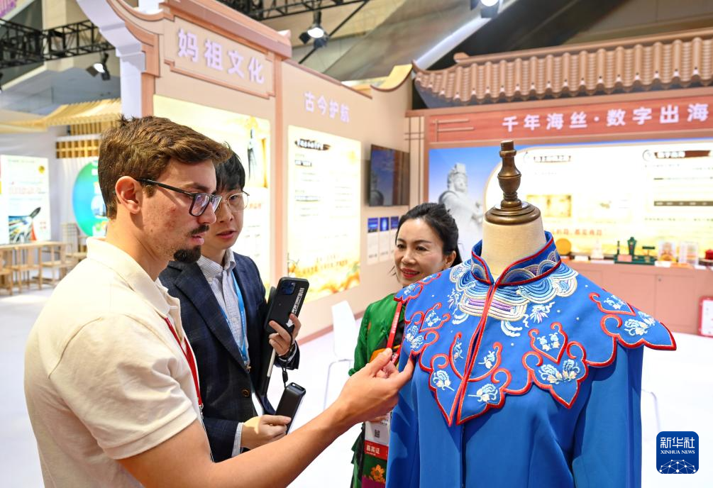 3月18日,巴西客人(左一)在妈祖文化主题专区了解特色服饰。新华社记者 林善传 摄