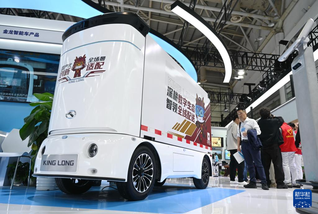 4月29日拍摄的第九届数字中国建设峰会现场体验区展出的金龙无人配送车。新华社记者 林善传 摄